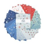 5in Squares, 100% Cotton - 42 pieces by Riley Blake Designs. A cute nautical motif with fish, birds, boats, lighthouses and more.
